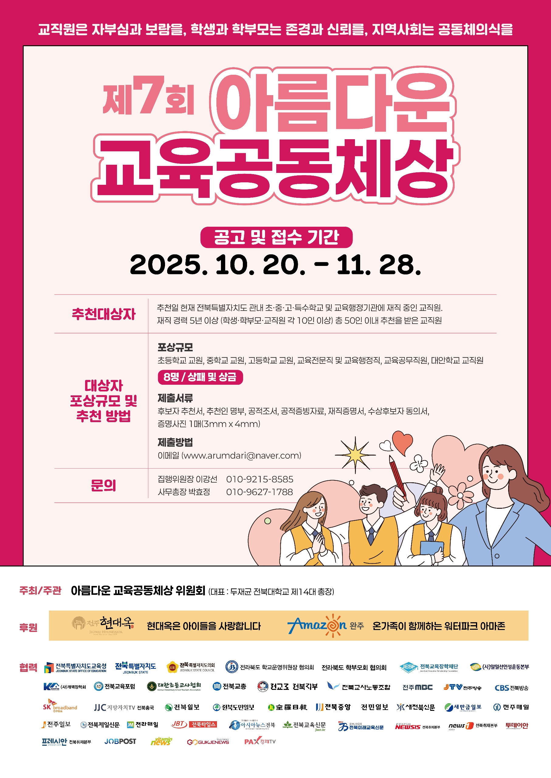 올해로 7회째를 맞이하는 '제7회 아름다운교육공동체상'에 저희 현대옥이 후원 참여합니다. 아름다운교육공동체상은 "교직원은 자부심과 보람을, 학생과 학부모는 존경과 신뢰를, 지역사회는 공동체의식을" 이라는 슬로건을 바탕으로 전북특별자치도 내 초·중·고등학교, 특수학교 및 교육행정기관에서 재직 중인 교직원을 대상으로 수상자를 선발하는 뜻깊은 행사입니다. 행사 포스터는 도내 각 학교에 부착되며, 전북특별자치도교육청과 시·군 교육지원청 홈페이지에도 게시될 예정입니다. 이를 통해 전북 지역의 학생 교사 교직원들에게 현대옥의 긍정적인 이미지를 널리 알릴 수 있을 것으로 기대됩니다. 현대옥 가맹본부는 이번 포스터를 전북 지역 내 40여 가맹점에 배포하여 매장에 부착할 예정이며, 이번 후원이 전북 지역 현대옥 가맹점들의 영업력 향상과 브랜드 이미지 제고에도 도움이 될 것으로 기대하고 있습니다. 아래에 행사 포스터를 첨부하였으니, 관심 있는 분들은 참고해 주시기 바랍니다. <행사 포스터>