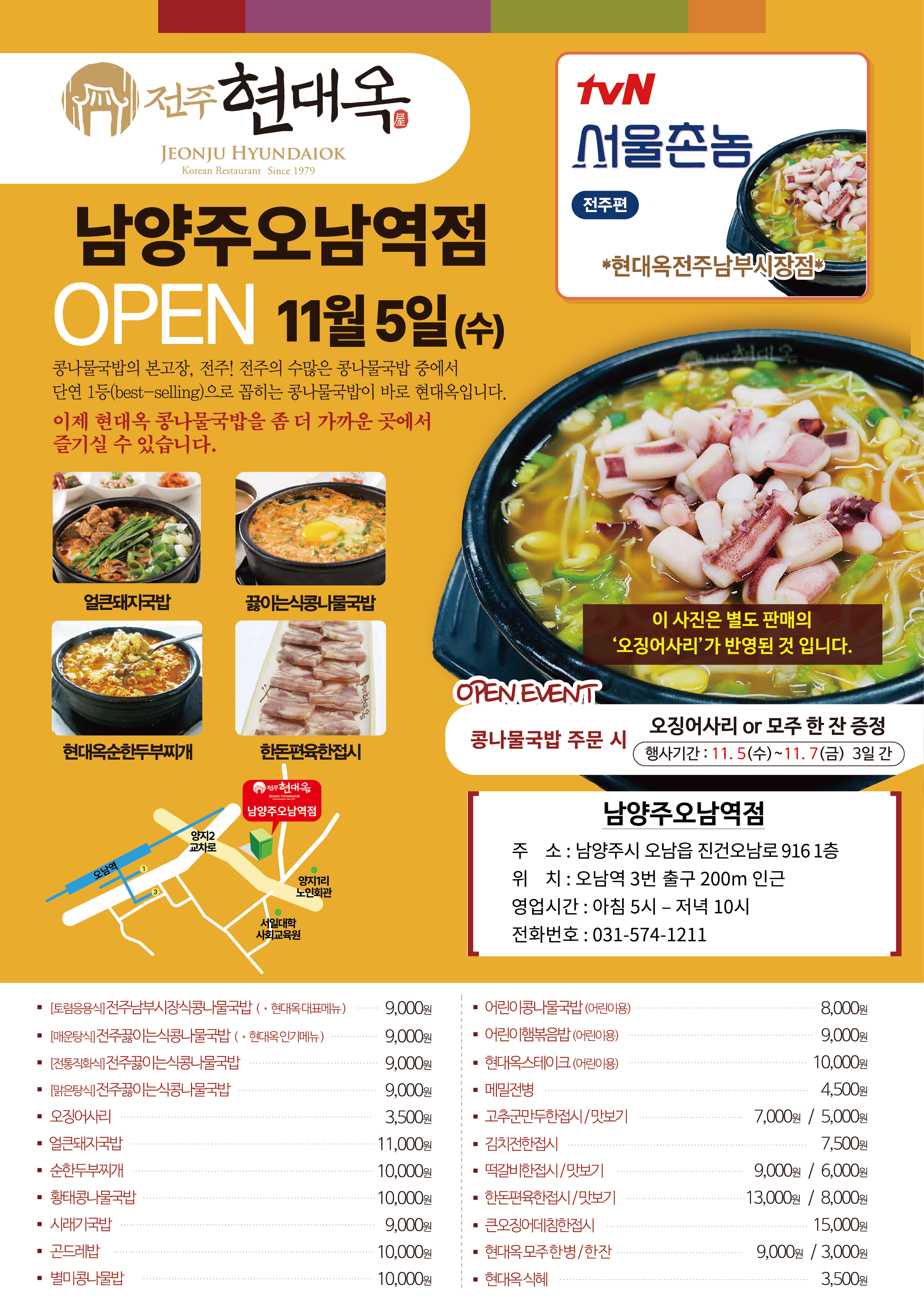 오늘자 경기도 남양주시 오남읍에 현대옥 남양주오남역점이 오픈하였습니다. 인근의 직장인들과 주민들께서도 이제 "전주에서 온 진짜배기, 전주현대옥콩나물국밥"을 가까운 곳에서 즐기실 수 있게 됐습니다.