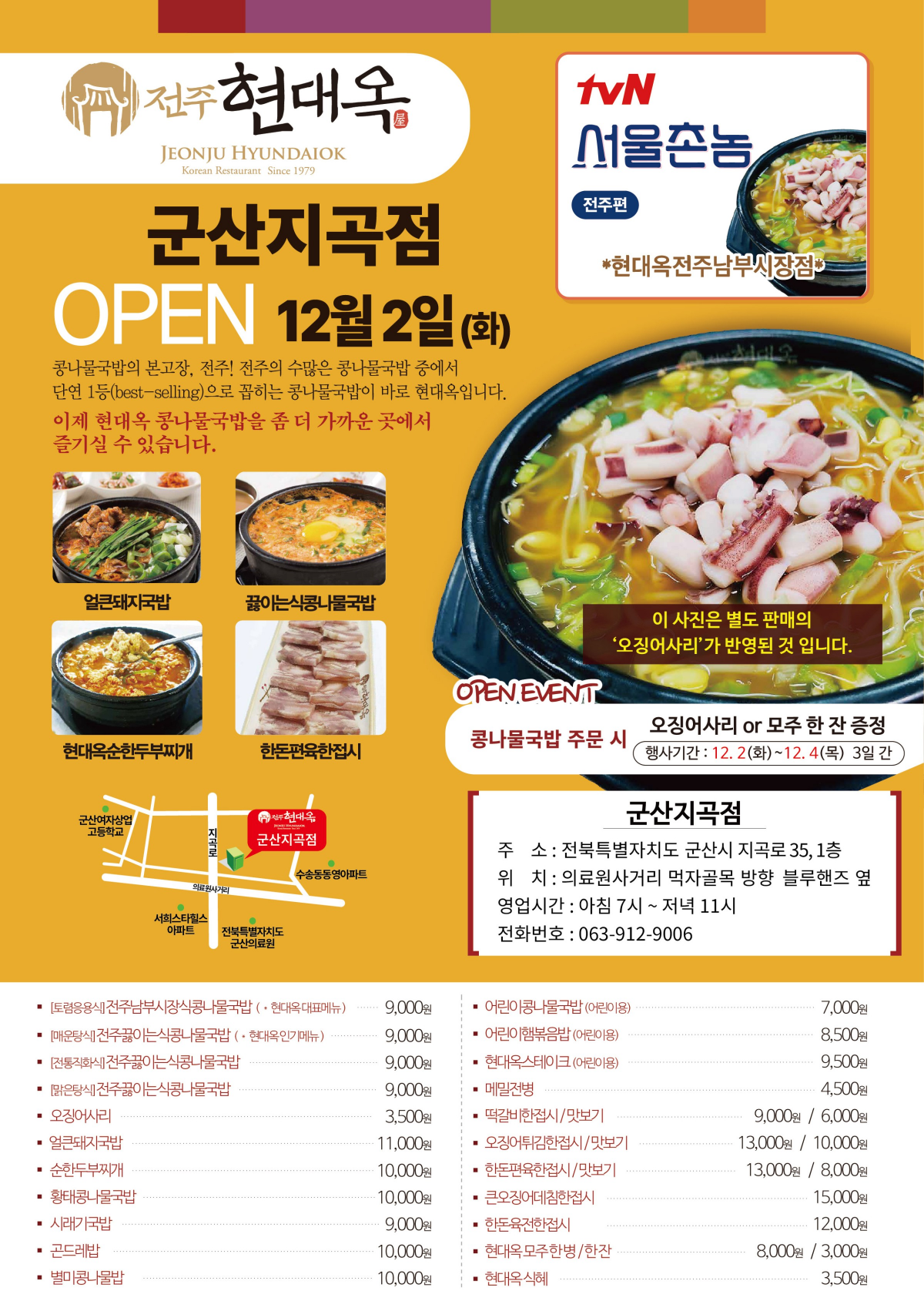 오늘자 전북특별자치도 군산시 지곡동에 현대옥 군산지곡점이 오픈하였습니다.