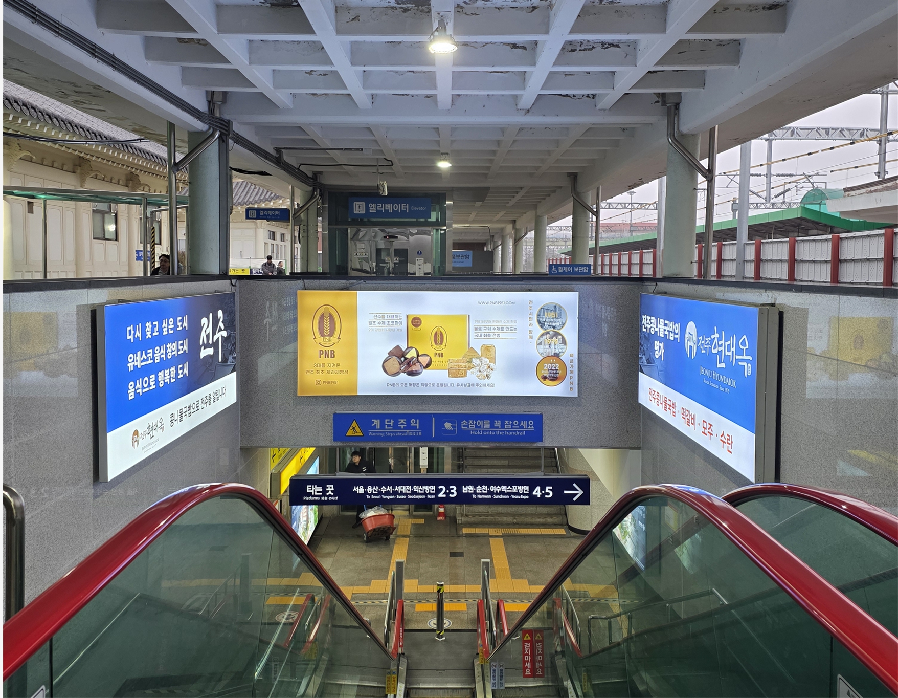 해당 전광판은 기차 승하차를 위해 이동하는 주요 동선인 에스컬레이터 상단에 위치해 있어, 전주역을 이용하는 시민들은 물론 전주를 찾는 여행객들까지 목적지와 관계없이 자연스럽게 현대옥 광고를 접할 수 있습니다.