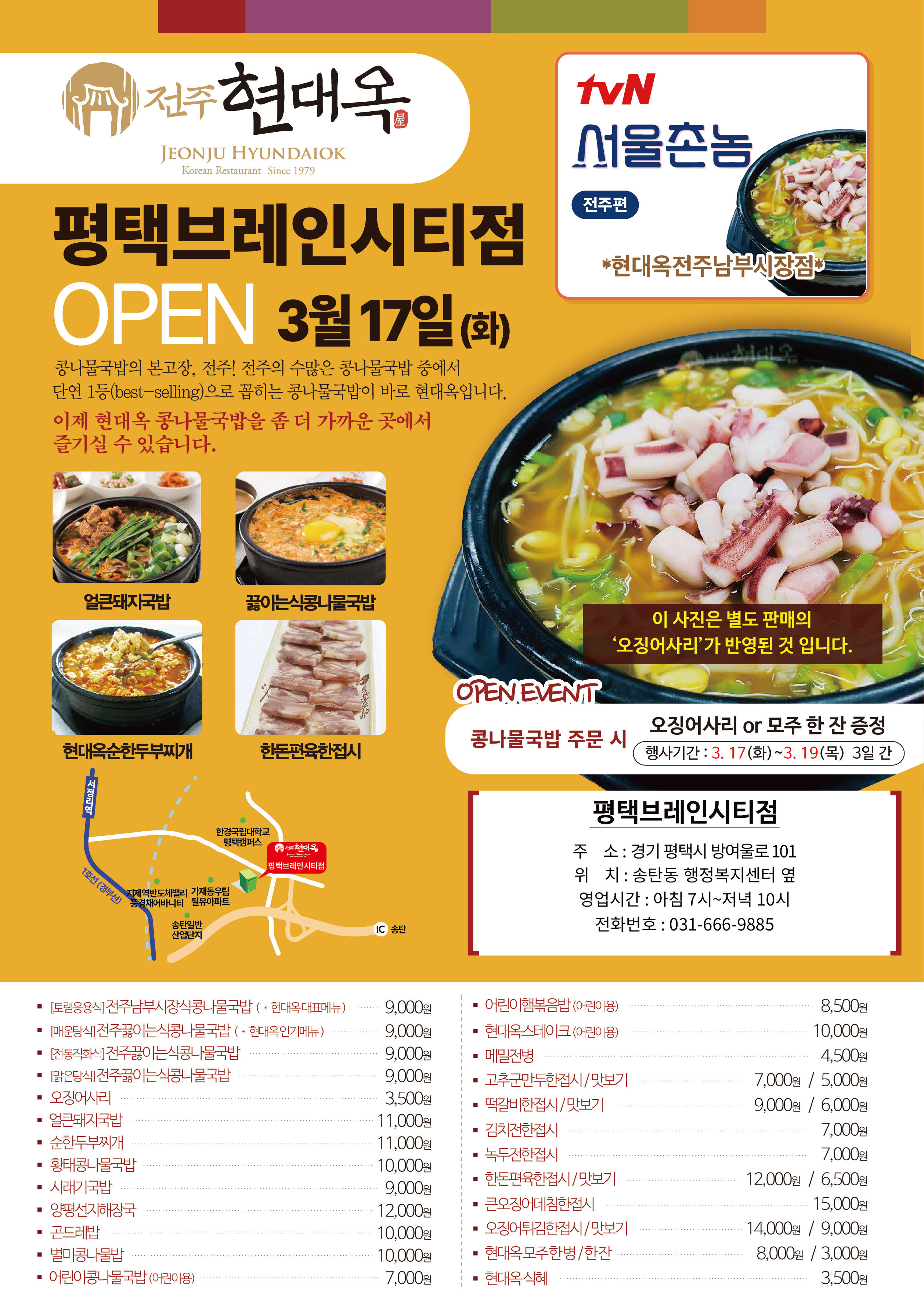 오늘자 경기도 평택시 가재동에 현대옥 평택브레인시티점이 오픈하였습니다. 인근의 직장인들과 주민들께서도 이제 "전주에서 온 진짜배기, 전주현대옥콩나물국밥"을 가까운 곳에서 즐기실 수 있게 됐습니다.